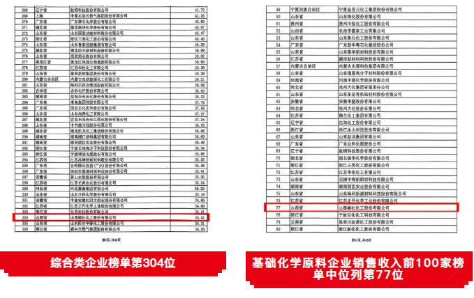 10月23日,2025石油和化工企業銷售收入500強發布會暨“數智新引擎 引領新征程”交流會在江西吉安召開。會上,2025中國石油和化工企業銷售收入前500家及分行業百家榜單正式揭曉,公司位列綜合類企業榜單第304位;在基礎化學原料企業銷售收入前100家榜單中位列第77位。