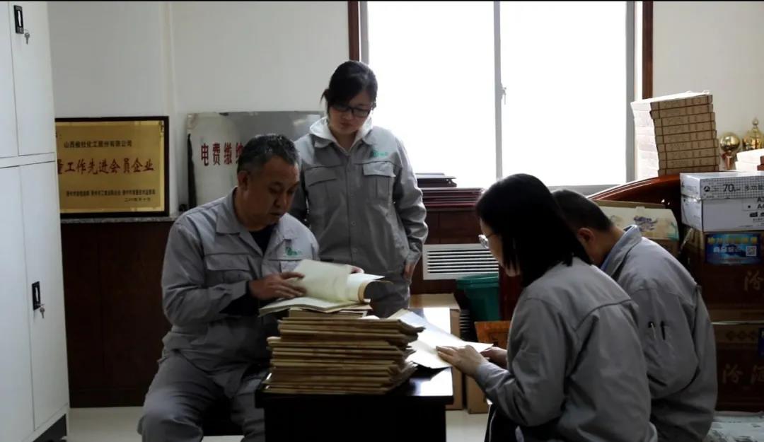 我們一次一次深入檔案室、縣檔案局,翻閱《化工簡報》、《榆社化工報》及其他卷軼浩繁的史料,隨著一本本塵封多年的檔案被開啟,一件件沉寂的往事被重新拾起,一個個曾經奮斗的身影被重新演繹......廠史編纂委員會的同事常常被卷宗上年久積落的灰塵弄得噴嚏連連、甚至皮膚過敏;被檔案里發黃紙張上模糊不清的字跡弄得眼睛酸澀發脹;堆積如山的資料,分類標記、逐頁翻閱,深怕遺漏,但凡看到國省市縣工業、化肥文件,榆化、化工字眼,反應大背景、相似事件等文件都要從中尋覓有價值的信息,共計翻拍298份文件,回到公司還需要熟練運用電腦技能,將瑣碎的資料整理成文檔,制作成圖表,編輯整理存檔......