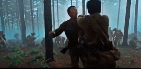 在影片中,有這樣一個情節:怒火中燒的雙眸,仿佛是雙目中的怒火點燃了箱子,也不知道是這雙眼睛中的怒火,還是點燃的破舊箱子的火焰,引得美軍的飛機猛烈的轟炸。胳膊、腿被炸斷了那又如何,怎么可能被你的狂轟濫炸而熄滅我的怒火?大無畏地爬到炮位,一個人完成六個人的操作那又如何,以驚人的毅力,是驚人的毅力!精準的一炮,有一絲浪費,沒有一絲拖泥帶水,在烈火中犧牲,這烈火不是那飛機造成的火焰,而是自己對敵人的怒火。畫面定格,就像一座不朽的雕像,“矢志于北,盡忠于國 ”這一幕,我掩面而泣……