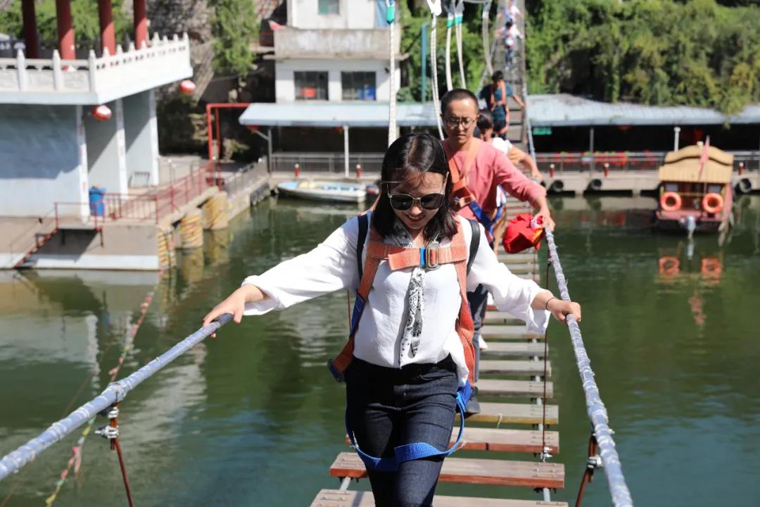 下一站到達“娘子關瀑布”,懸流百尺,順懸崖峭壁而下,形成了一幅絢麗的“水簾瀑布”,如噴珠散玉直瀉谷底。瀑布旁又有水簾洞……挨著它最近的就是玻璃棧道了,是依山傍水建在水上面,最讓難以忘懷的是那位吳姐姐,吳姐姐一路都是摸著自己的小心臟走完的。是忐忑不安?還是膽戰心驚?嘿嘿,我相信姐姐也有一種痛苦中的快樂。走路大約10分鐘,我們就來到了水上人家,循著潺潺水流一直曲折而行,小路彎彎,曲徑通幽處,那古意盎然的平陽民居,有著江南水鄉的風韻,淳樸的民風,八十年的葡萄樹,安靜的老屋,讓人有了隱居于此的想法。真是“名磨悠悠轉乾坤,浩浩清泉庭下流”呀!
