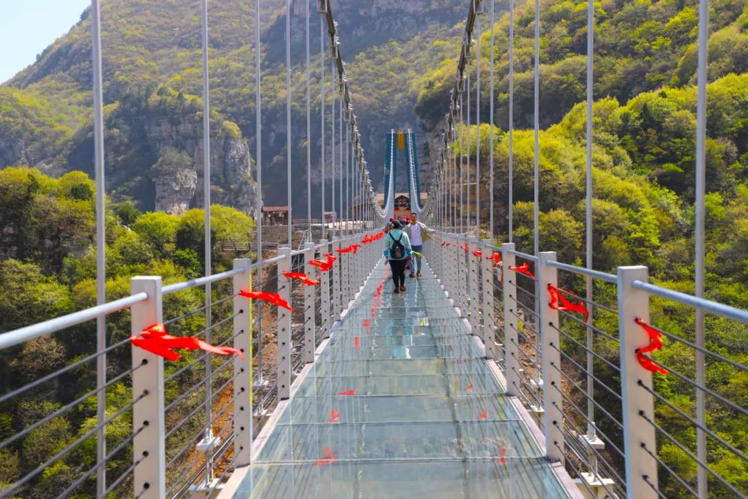 云丘山鴛鴦玻璃棧道,遠遠望去宛若一道晶瑩剔透的滑冰場。大家佇立橋上觀景,云丘山美景盡收眼底,縱橫群山之間,恍若人間仙境,走在玻璃橋上如臨深淵如履薄冰,有一種別樣的感受。