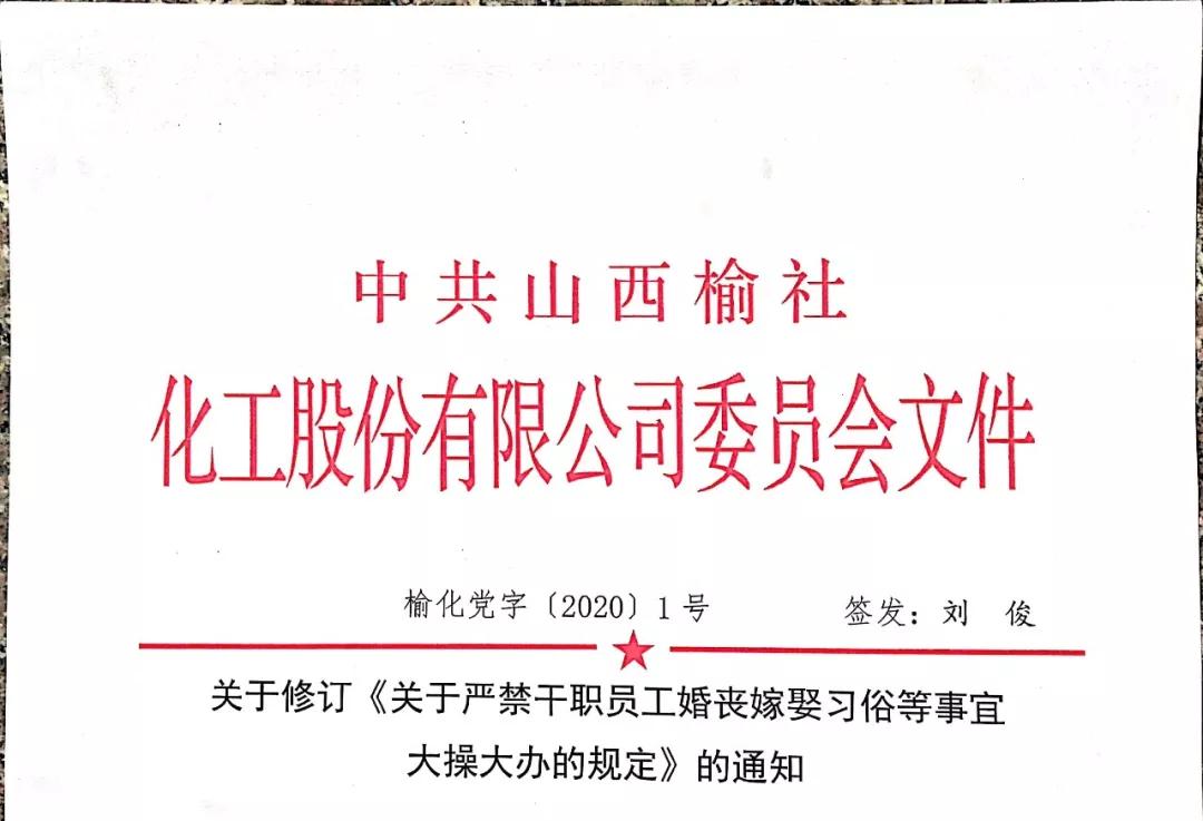 “經辦婚喪嫁娶習俗事宜要摒棄陋習,做到文明健康。副廠、部級以上領導遇本人結婚或子女嫁娶,要向公司監事會申報。喪事一律選用大燴菜,結婚或子女嫁娶宴請酒席飯菜可采用大燴菜或六菜一盆(盆:燴菜)”。