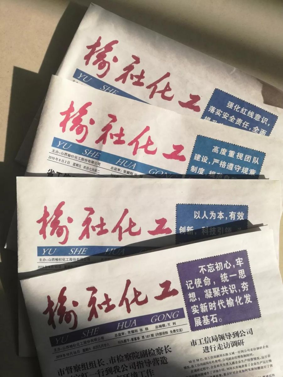 《榆社化工報》創刊于2004年2月23日,該報創刊之初,公司本著科學興企、文化興企的原則,旨在引導和約束員工遵章守紀并向著企業所制定目標的航燈前行,同時也是豐富員工文化生活的精神“食糧”。榆化報曾開辦了班組建設、一線采風、藝苑、企業動態、科技交流與研討、安全與質量論壇、調度會吹風、新聞集錦等欄目,外聘《山西畫報》社主編陳茂林同志擔任總編輯,由當時的五大分廠化肥廠、電化廠、熱電廠、樹脂廠、化機廠和辦公室、秘書處、財務、保衛及榆化賓館等機關科室選派20余名通訊員共同開展工作。該報歷時15年8個月,最后一期報紙發行于2019年10月26日,共計發行181期。