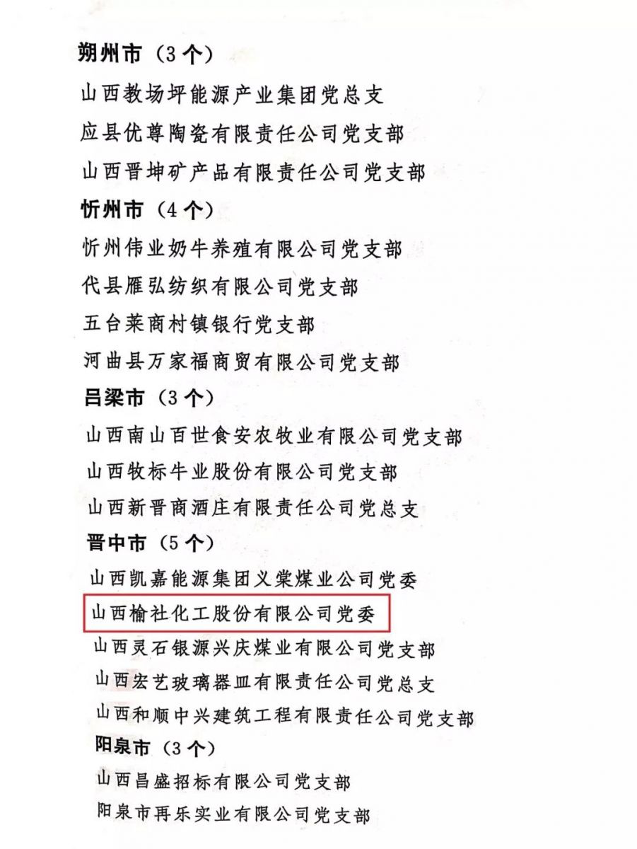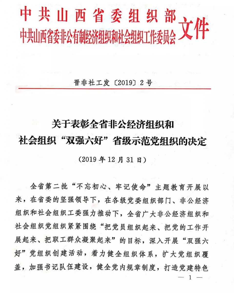 2019年12月31日,公司被省委組織部、省委非公和社會組織工委授予“雙強六好”省級示范黨組織榮譽稱號。