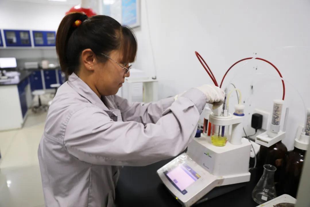 精細化工廠員工正在做氯乙酸成品中的水分分析