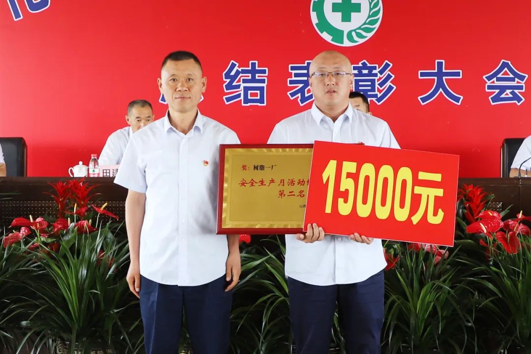 副總經理劉洋為獲得“安全生產月”活動綜合排名第二名的樹脂一廠頒獎