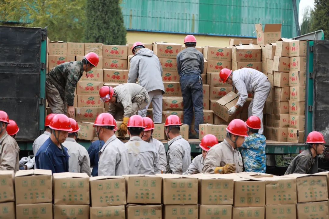 10月20日,伴隨著貨車緩緩駛進榆化,原本寂靜的廠區一下變得熱鬧起來。貨車一到,工人師傅們立馬擼起袖子拉開車門開始搬卸。利落打開車門,一躍而上,掀開保溫布,有條不紊地把一箱箱祁縣紅薯遞給車下的工友,一排一列,整齊碼垛成座座“小山”。