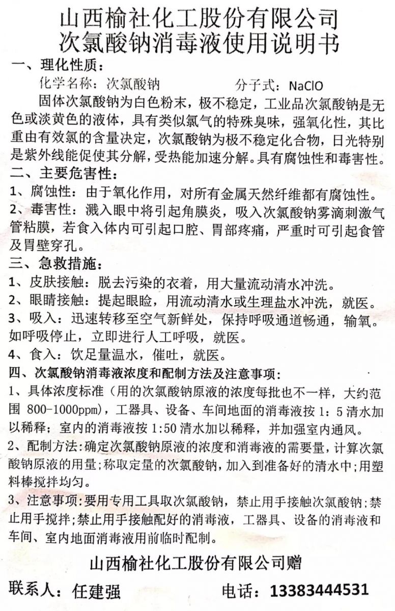 最后,榆化公司再次提醒大家,為各單位提供的次氯酸鈉消毒液濃縮制劑屬于危化品,一定要小心使用。(張云)
