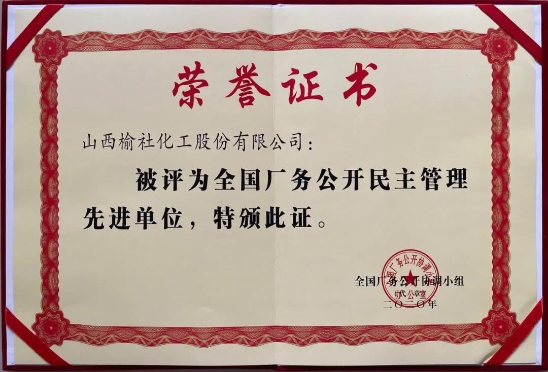 山西榆社化工股份有限公司通過開展企務公開、民主管理工作,促進企業廉政建設,榮獲“全國廠務公開民主管理先進單位”榮譽稱號。