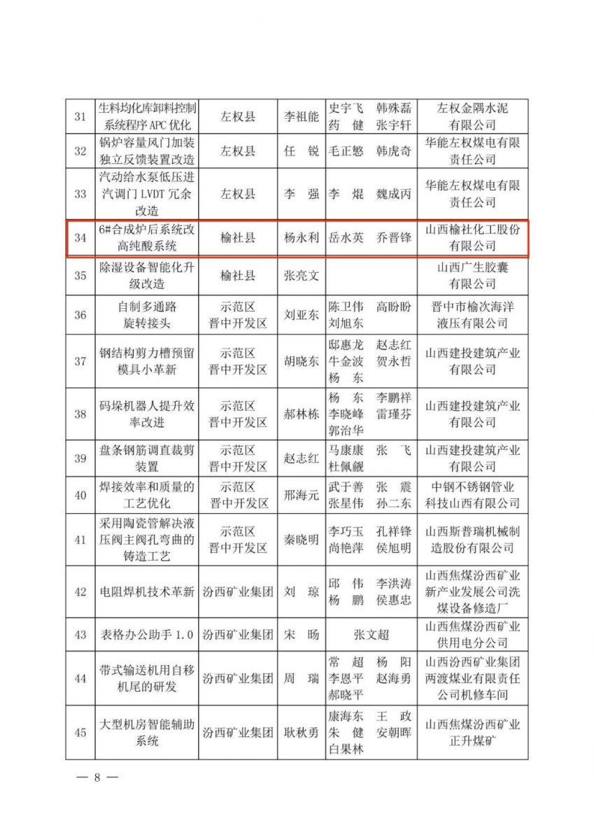 近日,2022年度晉中市“五小”優秀成果表彰名單公布,公司“6#合成爐后系統改高純酸系統”等5個項目獲得表彰,其中榮獲二等獎1項,三等獎4項。