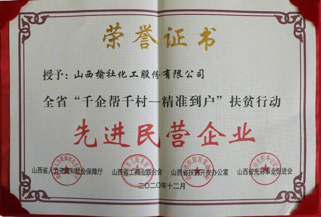 近日,在由山西省人力資源和社會保障廳、山西省工商業聯合會、山西省扶貧開發辦公室、山西省光彩事業促進會等四家單位聯合舉辦的全省“千企幫千村——精準到戶”扶貧行動先進民營企業表彰大會上,公司榮獲“先進民營企業”榮譽稱號。