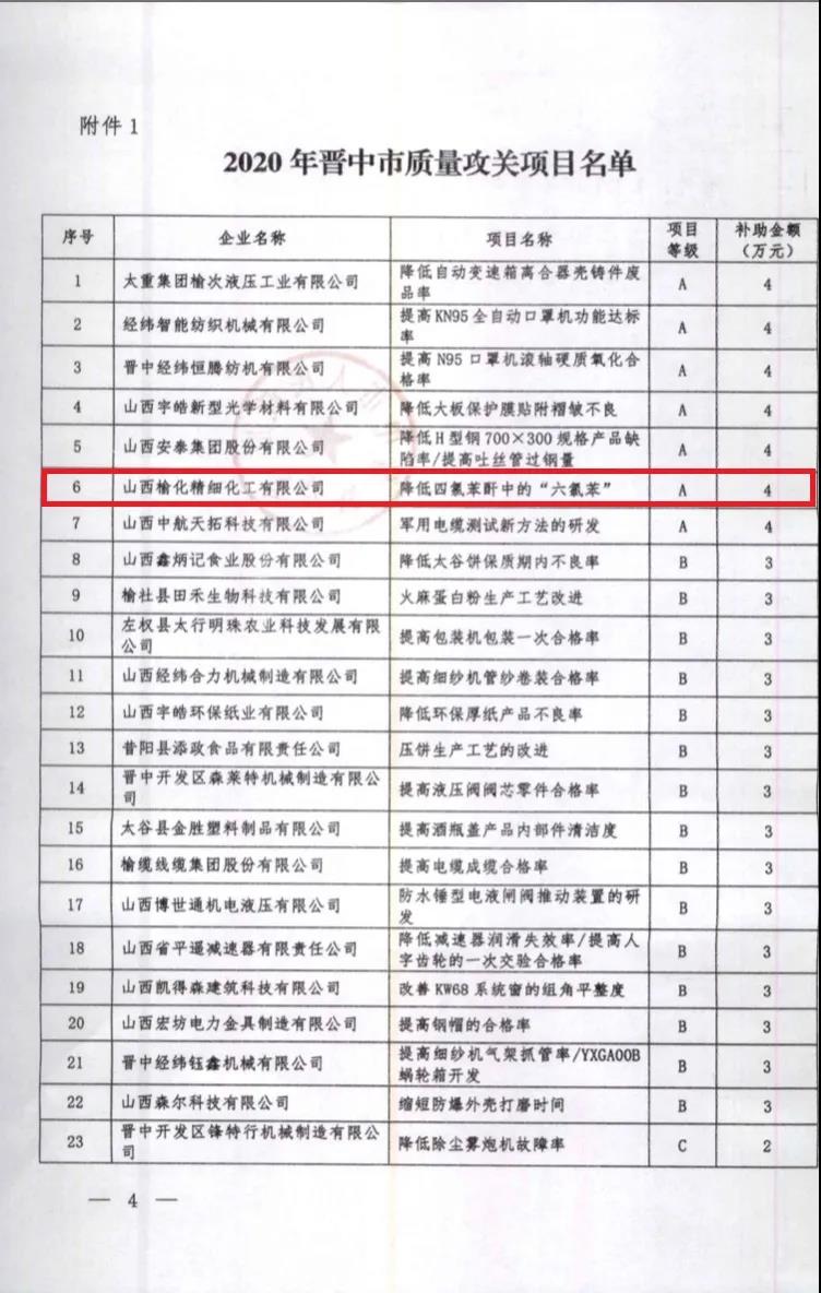 近日,2020年度晉中市質量攻關項目名單揭曉,山西榆化精細化工有限公司申報的《降低四氯苯酐中的“六氯苯”》獲得A類的優異成績。