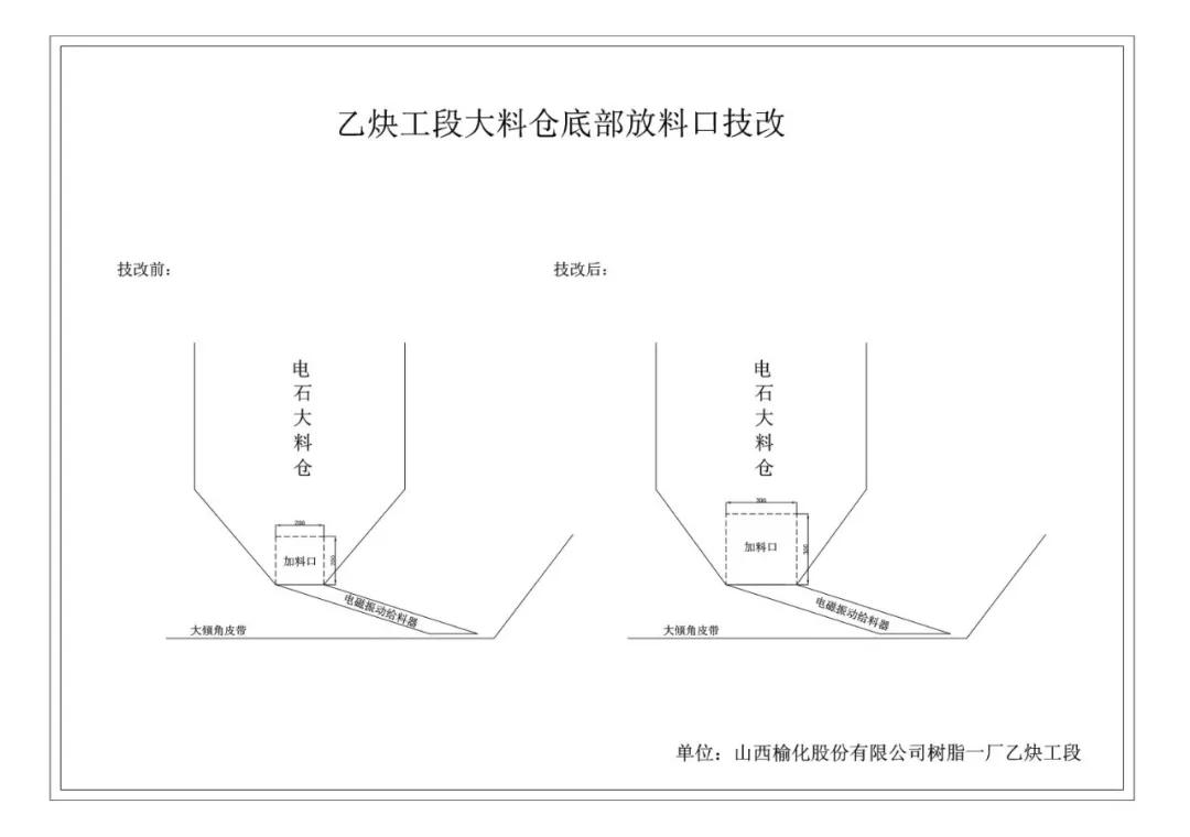 樹脂一廠乙炔工段電石存儲倉,由于設計出口(錐形方口)窄小,造成運行中(放料)頻繁出現卡、阻,對生產安全造成很大影響。